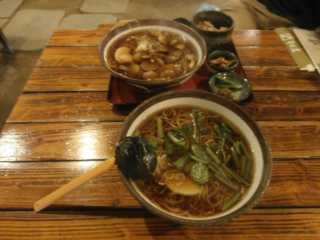 ↓宿の近くのお蕎麦やさんでお昼ご飯。見たらわかる手前が山菜そば。向こうが茸そば定食。